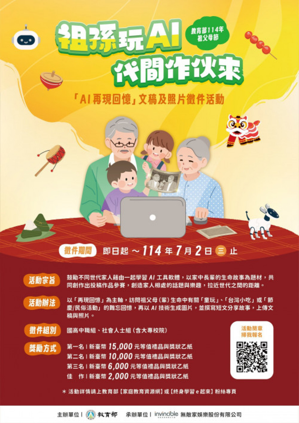 二、 為促進代間互動,鼓勵不同世代家人藉由一起學習AI工具軟體,以家中長輩的生命故事為題材,共同創作出投稿作品參賽,創造家人相處的話題與樂趣,拉近世代之間的距離,爰辦理旨揭徵件活動。