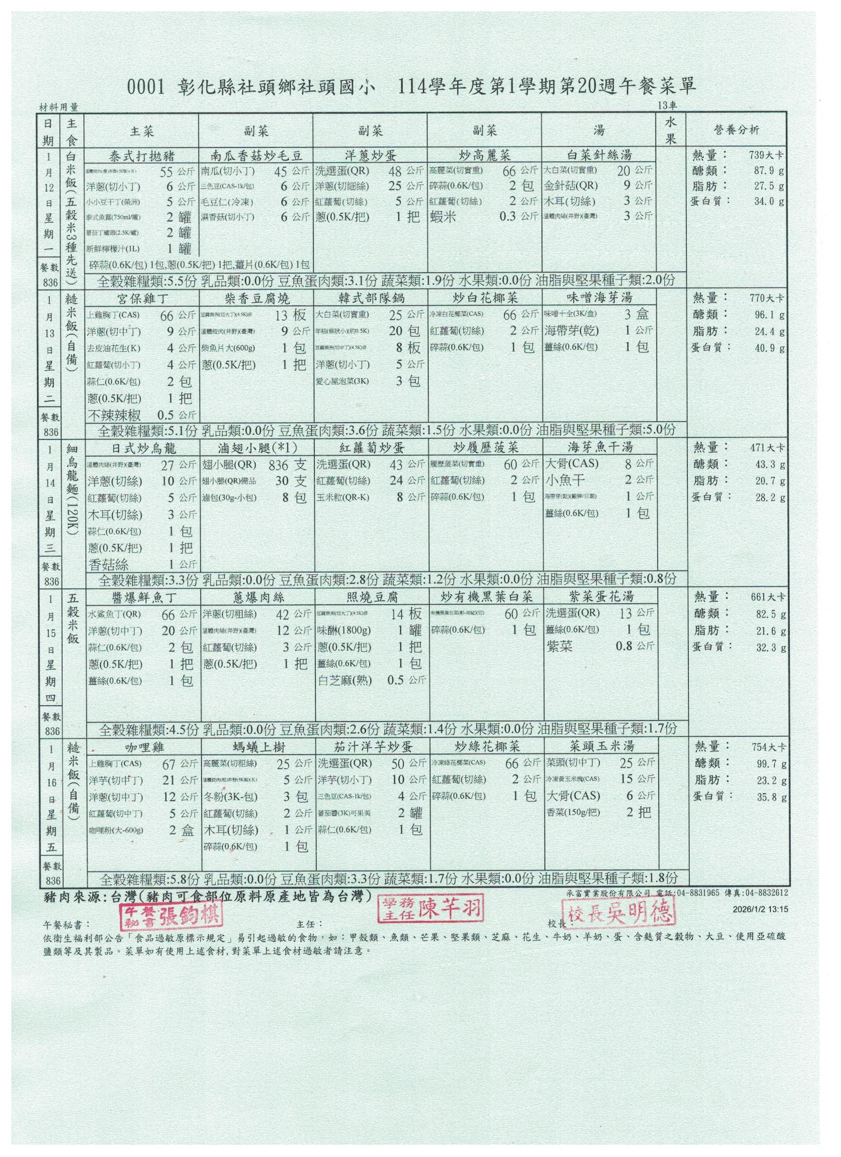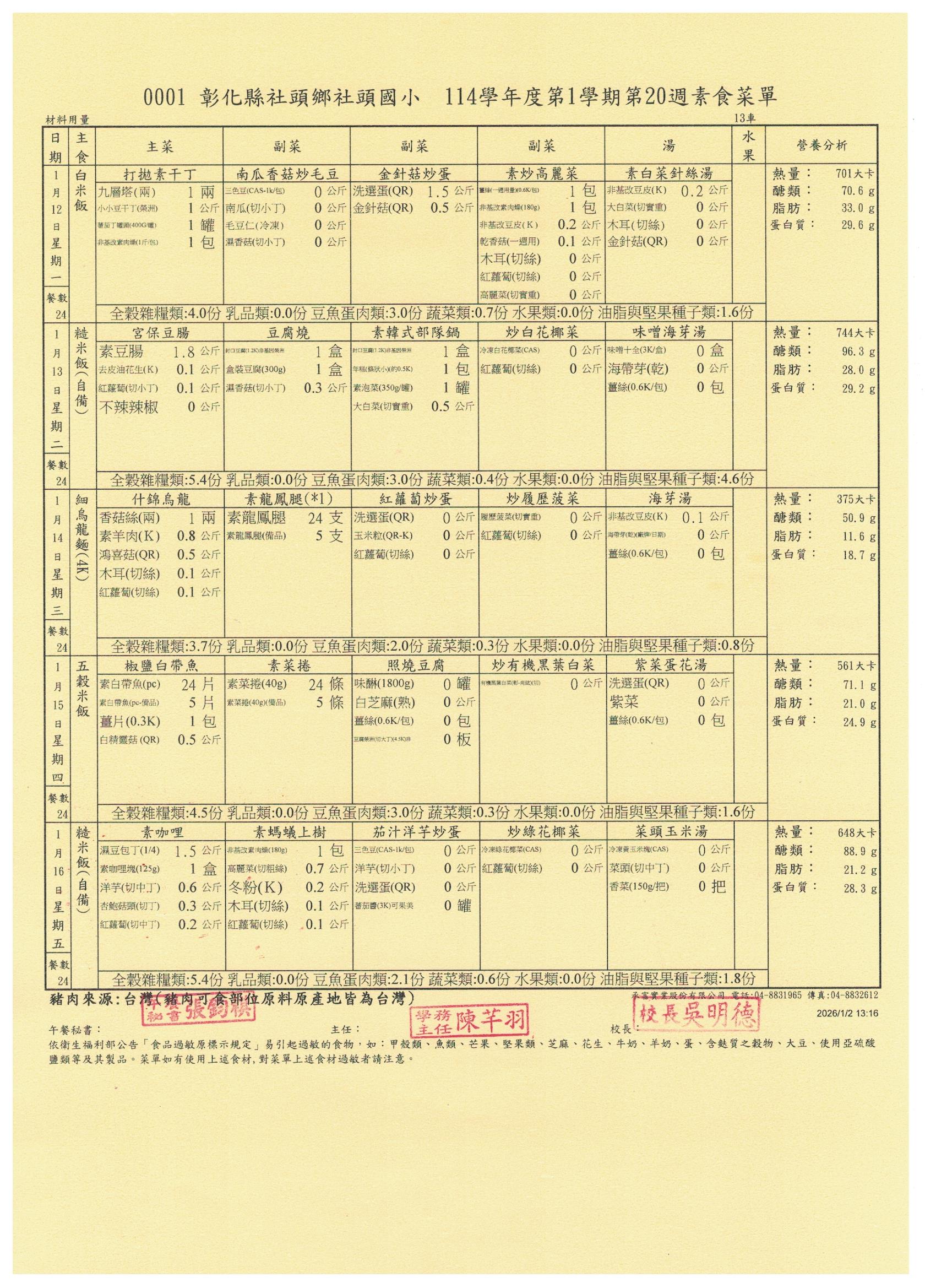114學年度上學期第20週菜單